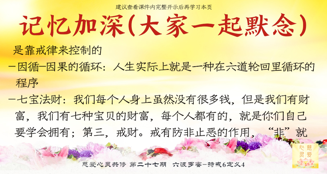 其实我们每个人身上虽然没有很多钱,但是我们有财富,我们有七种宝贝的财富,每个人都有的,就是你们自己要学会拥有。在《普门品》中曾经讲过金银玛瑙等七宝,七宝是人间的宝贝,七宝有法财。。。第三,戒财。戒有防非止恶的作用,“非”就是不好的东西,“止恶”就是制止你的邪恶。你看看很多人就是贪,“我再去投资”,全部套住了,最后血本无归。看见了吗?你不守戒,你就没财了。所以叫你们守戒,不要去贪,可能你就有财了。你要严持佛法的戒律。你想想看,如果不贪,你会失去吗?越贪失去越多;越恨,是不是恶念就多了?你恨别人是不是要去报复?你到时候会不会受伤?你今天守戒了,不去贪了,“我够了,就这点钱,我不要投资多,我不要赚回来很多”,你自己的财是不是就守住了?是不是叫戒财?戒是什么意思?戒就是不管做什么事情,自己要守住自己的底线,别人再怎么样,有自己人生的底线。就像我们做人,有自己的底线吗?人终有底线的,人家叫你去偷东西,说“偷好了,我们大家都受益”,你可以偷吗?你有底线的。所以在佛法界中有三皈依戒、五戒、八关斋戒、沙弥戒、沙弥尼戒、比丘戒、比丘尼戒,菩萨戒都有。过去在僧团里要看谁的戒受得多、受得高,这个法师就受别人的尊敬,你们谁把自己的戒守得好、守得严,你就受到别人的尊敬。
